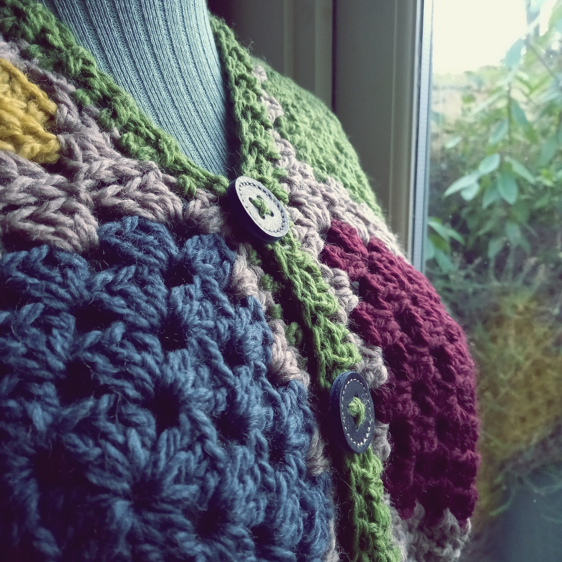 Composition: Super soft pure wool and acrylic blend chunky yarn (glorious stuff) with handmade leather buttons.