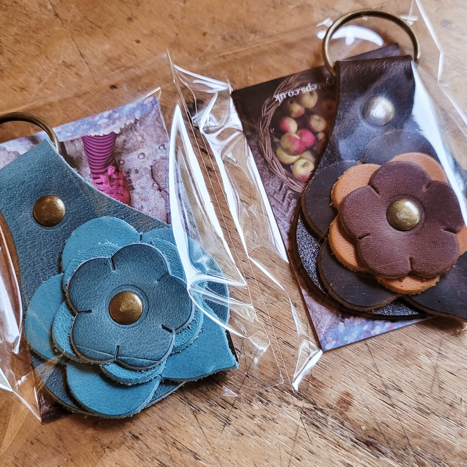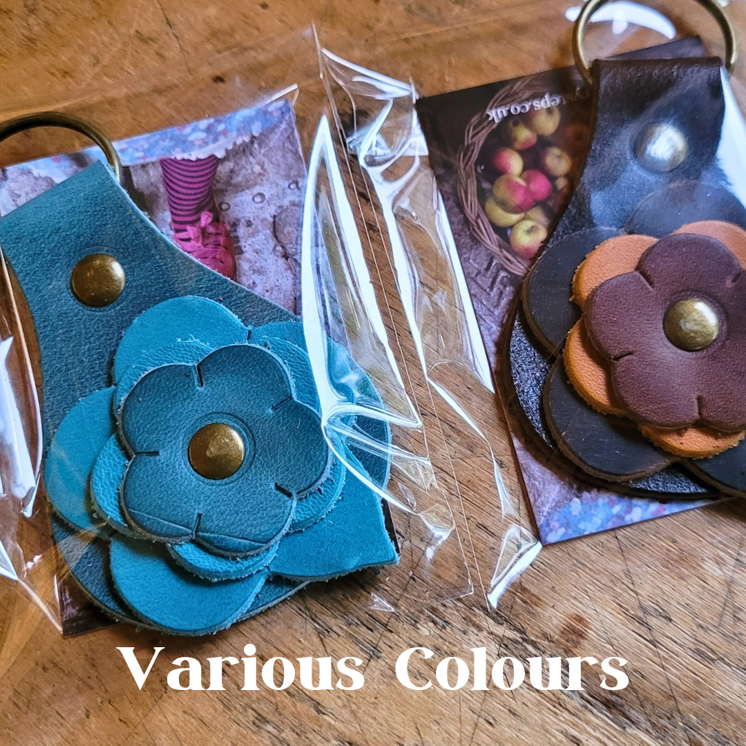 Leather Keyfob with a multi layered blossom. Colours are noted in drop down, too many to photograph individually. Each fob contains various premium heavy leathers from Italian tanneries. Total height: 10cm. Listing is for ONE fob.