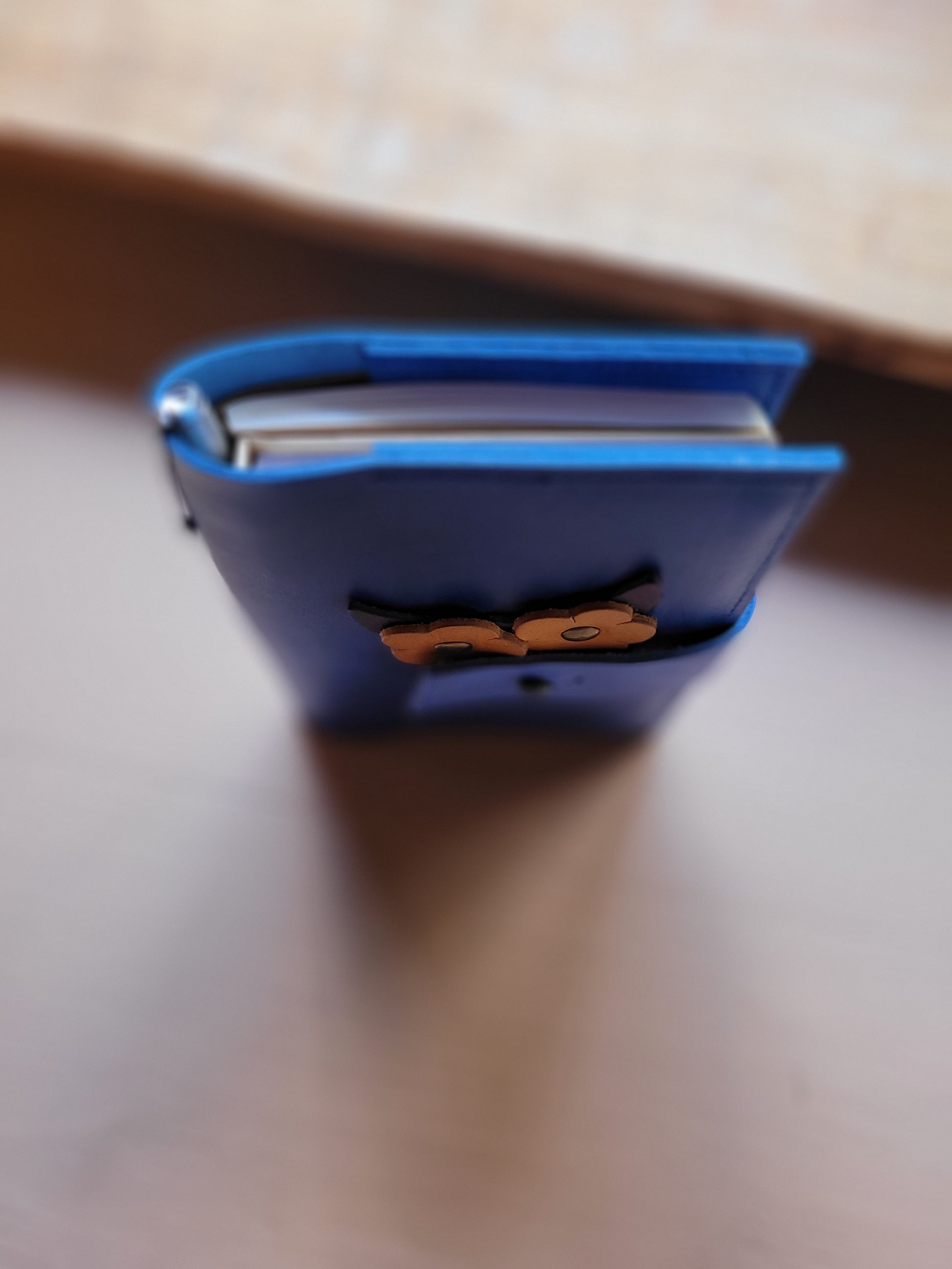 The whole caboodle closes securely & easily with a wide strap and stud button to keep your words safe. It's the ideal size to pop in a bag for expeditions. Room for a chunky ink pen to clip inside.