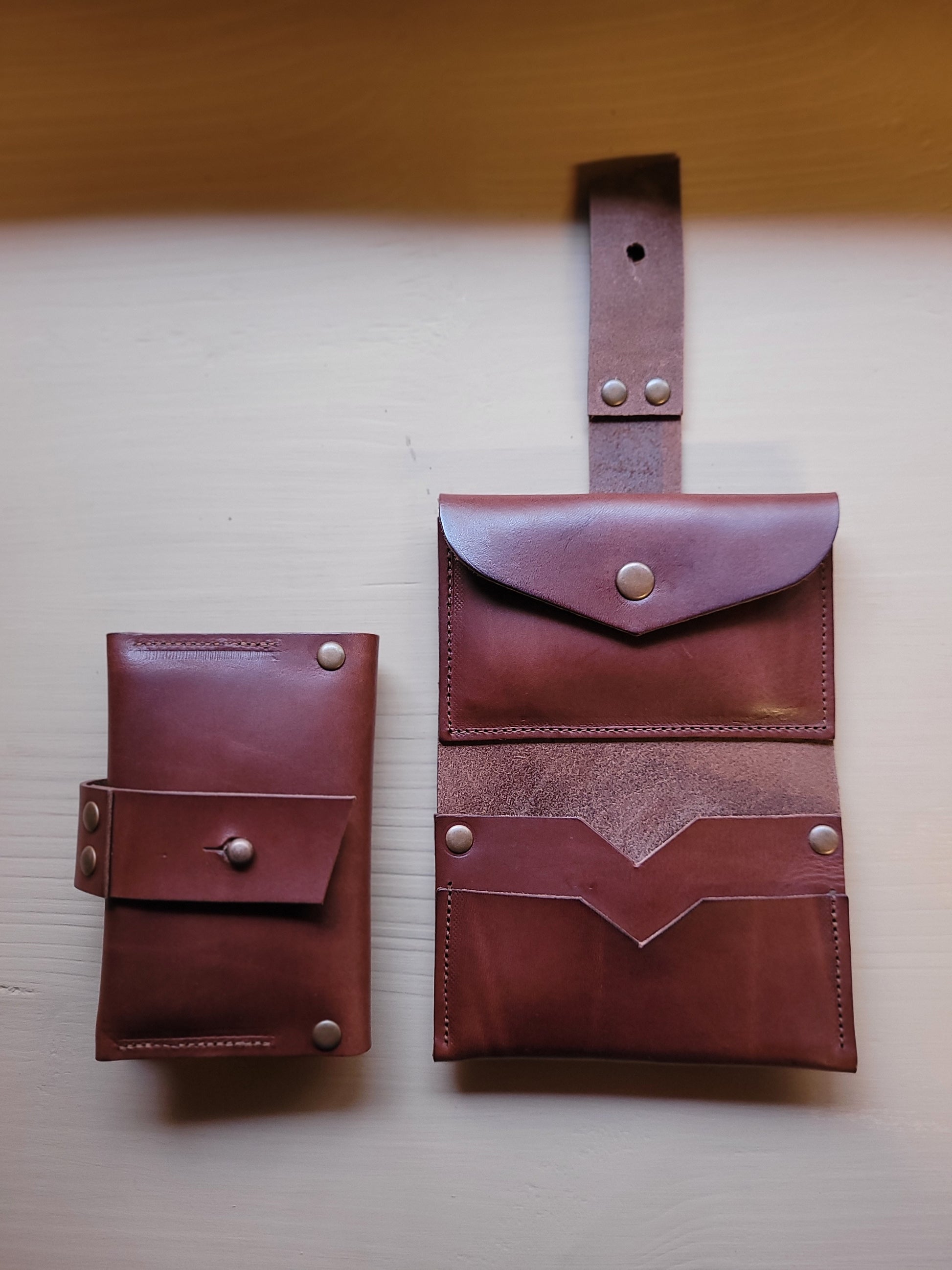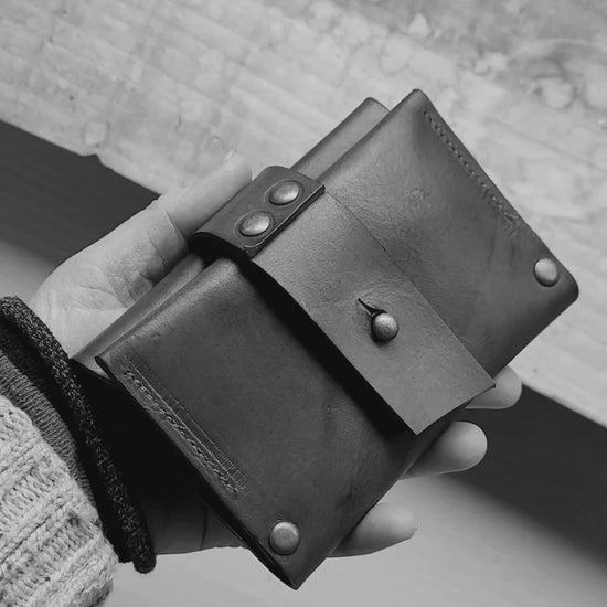 Very much a 'keep it all in one place' wallet. Stylish, practical and equally suited for Men and Women. Triple compartments for organising your treasure. Two open ones for debit / credit cards and notes. Plus a large pocket with snap closure for coins. The whole caboodle closes securely and easily with a wide strap and stud button to keep your bounty safe.